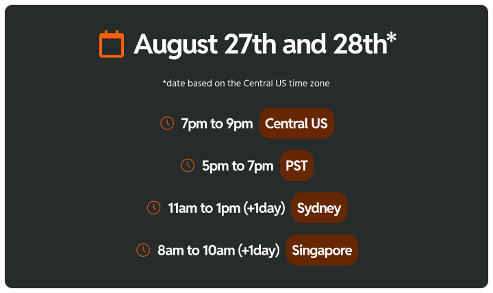When? 📆 August 27th and 28th at 7pm to 9pm (Central US)