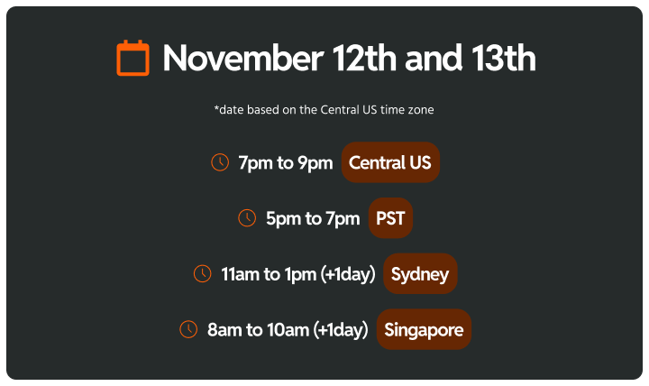 When? 📆 November 12th and 13th at 7pm to 9pm (Central US)