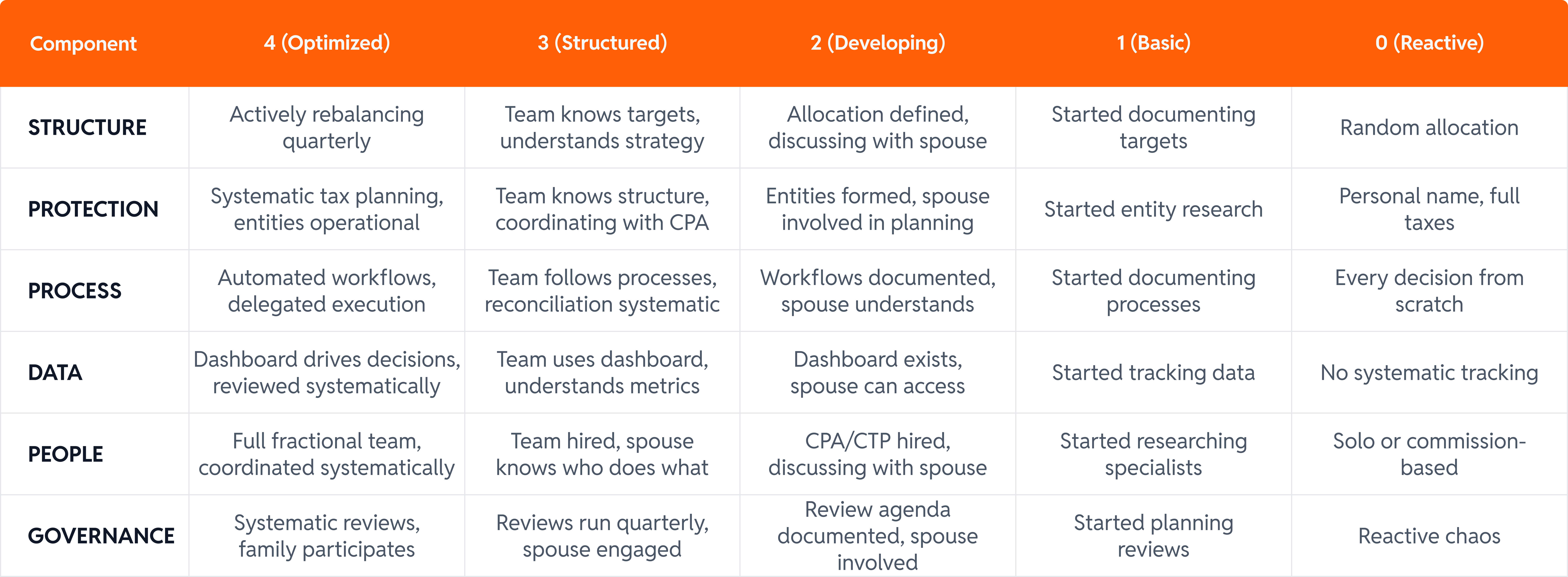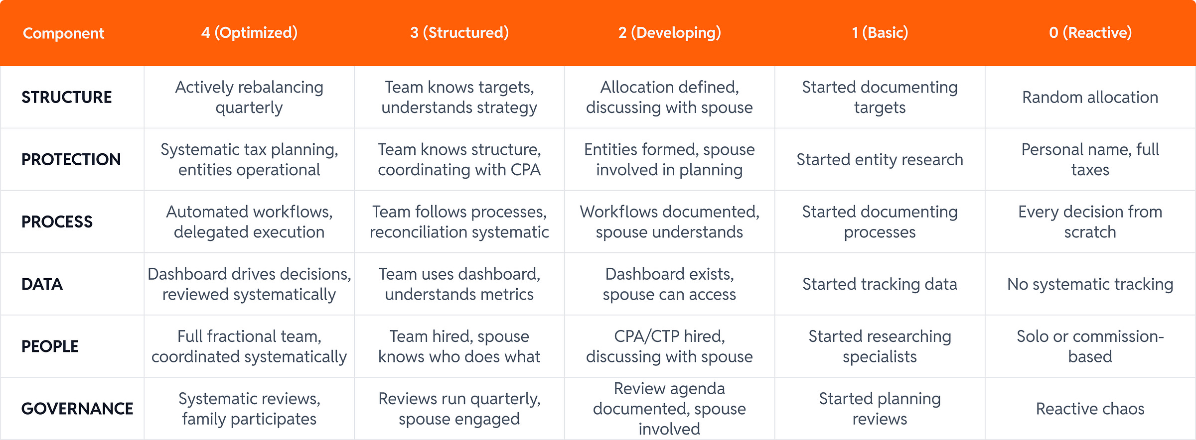 P.S. When I scored 8 out of 28 in 2016, I felt behind. Then I realized: most people with my portfolio size scored 0-7. They were compensating for missing infrastructure through personal heroics—60+ hours monthly managing wealth instead of building it. The real insight? Most people who score 7-14 have created documents but haven’t operationalized them. Their families don’t know the vision. Their teams aren’t aligned. That’s where the transformation happens—Level 3, when you move from artifacts to operations.