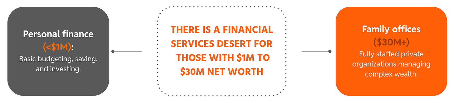The service desert exists because nobodyâs built for the middle. Advisors want AUM. Family offices want scale. Nobodyâs focused on $1M-$30M because the unit economics donât work for traditional models.